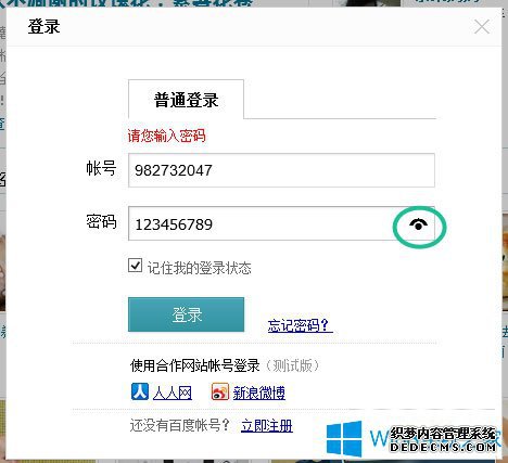 Win8中,登陆账号填写密码的时候,可以在密码框右侧按住显示明文密码的按钮,防止你将密码输入错误,这个功能也是很不错的。